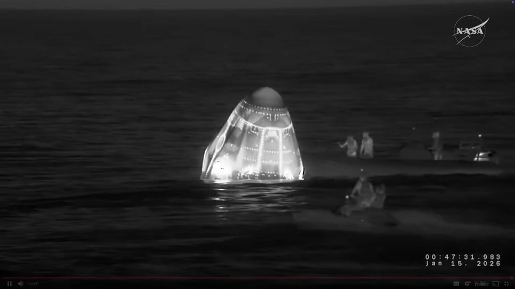 Корабите за възстановяване се приближават до капсулата SpaceX Crew-11 на НАСА след падане посред нощ близо до Сан Диего, Калифорния, през януари. Снимка: НАСА чрез AP