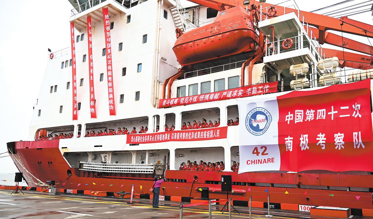 Сюелонгили Снежен дракон, акостира в базата си в Шанхай в четвъртък. Корабът се върна в Шанхай след 160-дневно пътуване, което беше част от 42-рата антарктическа експедиция на страната. КИТАЙ ДЕЙЛИ