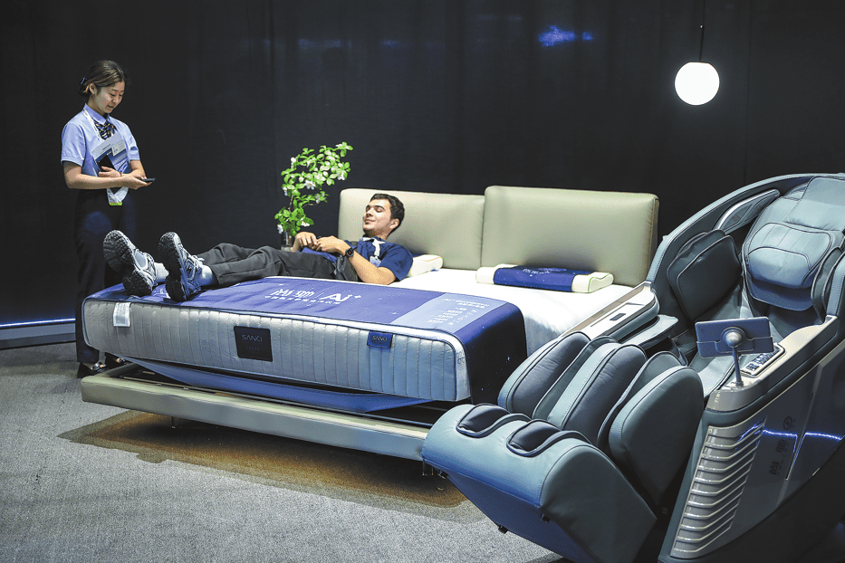 Посетител изпробва легло, поддържано от интелигентни технологии по време на изложение за домакински уреди в Шанхай през септември. КИТАЙ ДЕЙЛИ