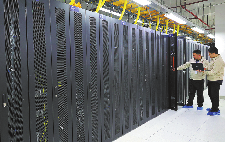 Техници проверяват оборудването в съоръжение за големи данни в Lianyungang, провинция Дзянсу, на 19 февруари. GENG YUHE/ЗА КИТАЙ ДАЙЛИ