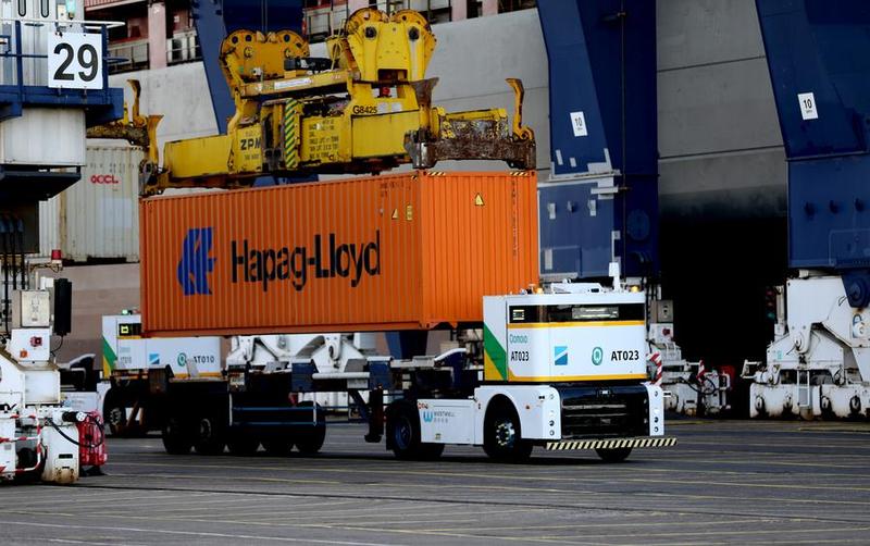 Автономен електрически камион от китайската технологична компания Westwell се готви да зареди контейнер в пристанище Феликстоу във Великобритания, 20 ноември 2025 г. [Photo/Xinhua]