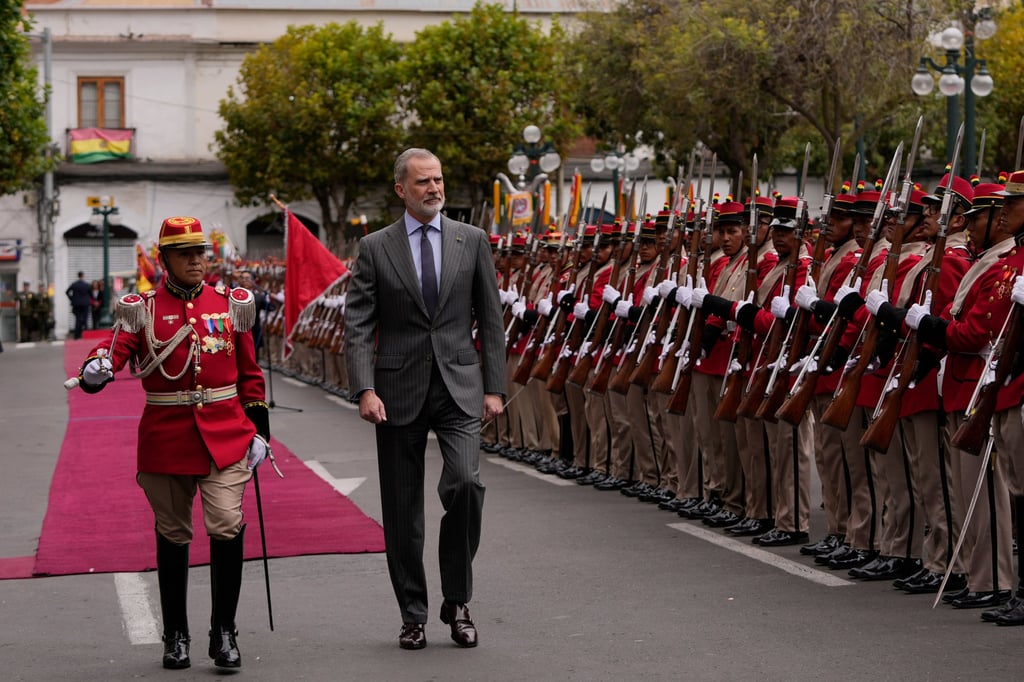 Испанският крал Фелипе получава военни почести в Ла Пас, Боливия, по-рано този месец. Снимка: AP