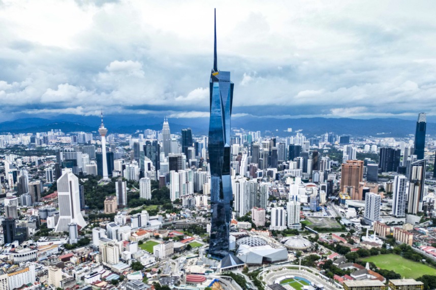 Въздушна снимка с дрон, направена на 24 октомври 2025 г., показва Merdeka 118, мястото за провеждане на китайските и американските икономически и търговски преговори, в Куала Лумпур, Малайзия. [Photo/Xinhua]