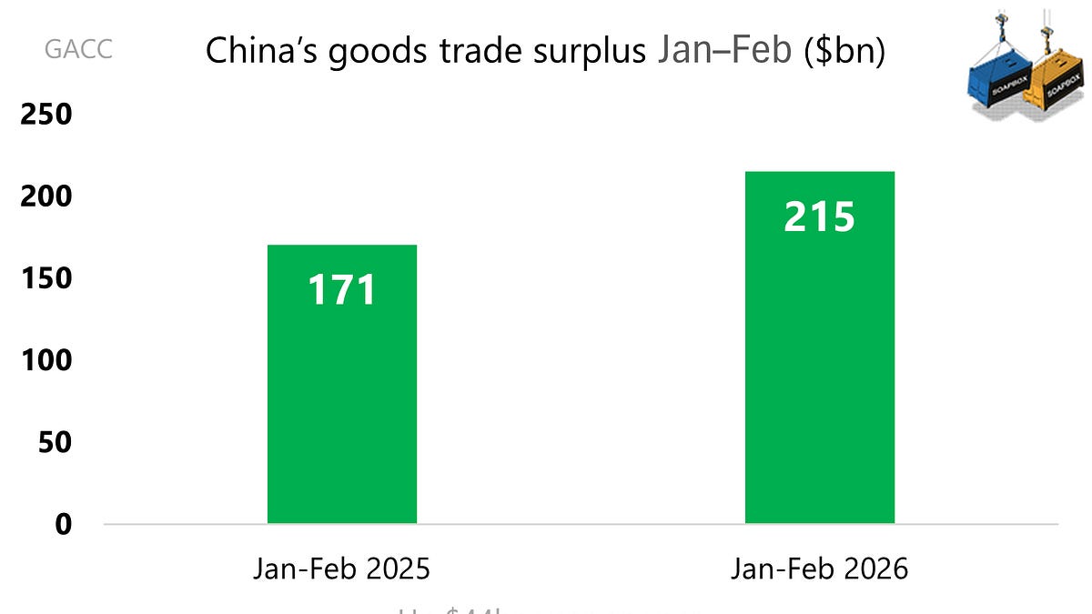 През последните дванадесет месеца излишъкът в търговията със стоки на Китай беше 1,24 трилиона долара. През януари–февруари 2026 г. той се е увеличил с 45 милиарда долара в сравнение със същия период на предходната година.