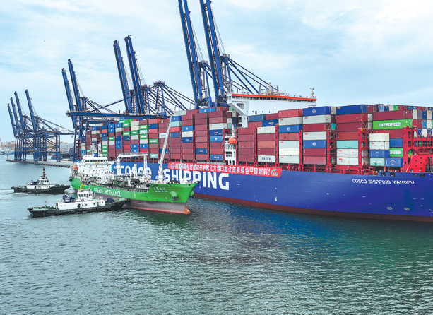 Контейнерски кораб акостира в пристанище Далиан в провинция Ляонин на 15 юли. СИНХУА