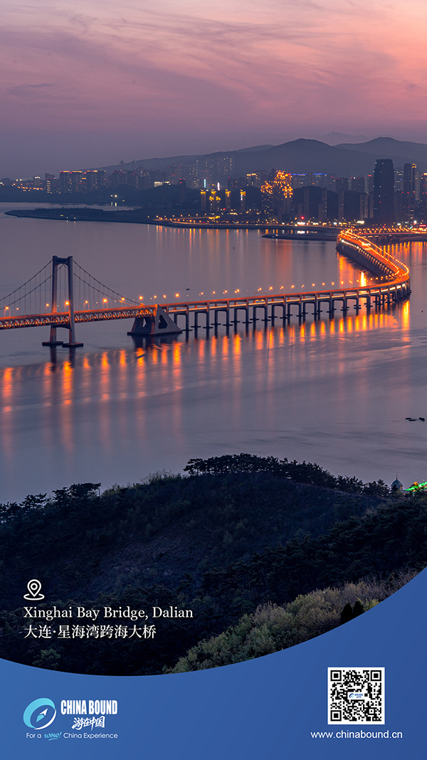 С падането на здрача мостът на залива Синхай в Далиан, Ляонин, светва като златен дракон, почиващ над Жълто море. Нанизи от топли светлини образуват течаща галактика през нежните вълни. В този град, който процъфтява край морето, далечният силует и блясъкът на моста се отразяват взаимно – сгъвайки романтиката на пейзажа и метрополиса в мекия здрачен вятър.