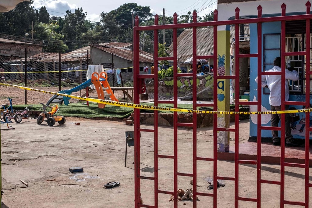Общ изглед на отцепеното от полицията училище по програмата за ранно детско развитие Ggaba след нападение срещу деца в Кампала в четвъртък. Снимка: AFP