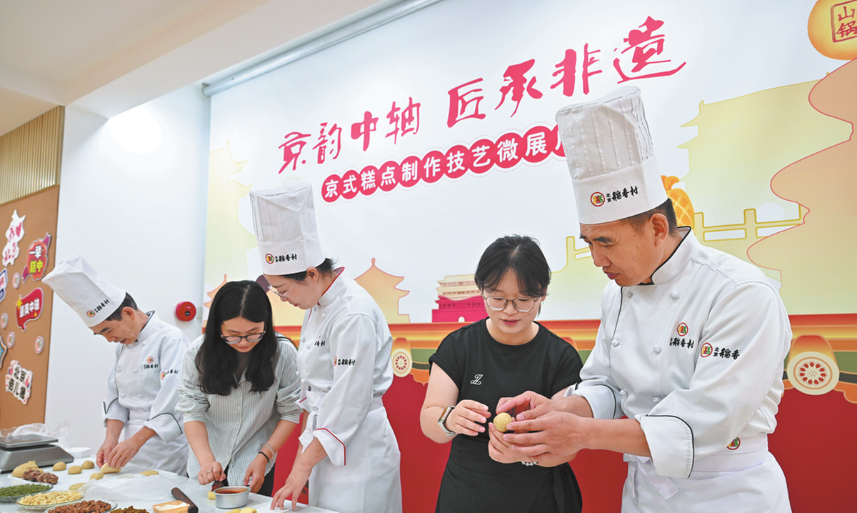 Главен готвач на сладкиши инструктира посетителите как да правят лунни торти на изложба на умения за приготвяне на сладкиши в пекински стил на 5 септември. JIN LIANGKUAI/XINHUA