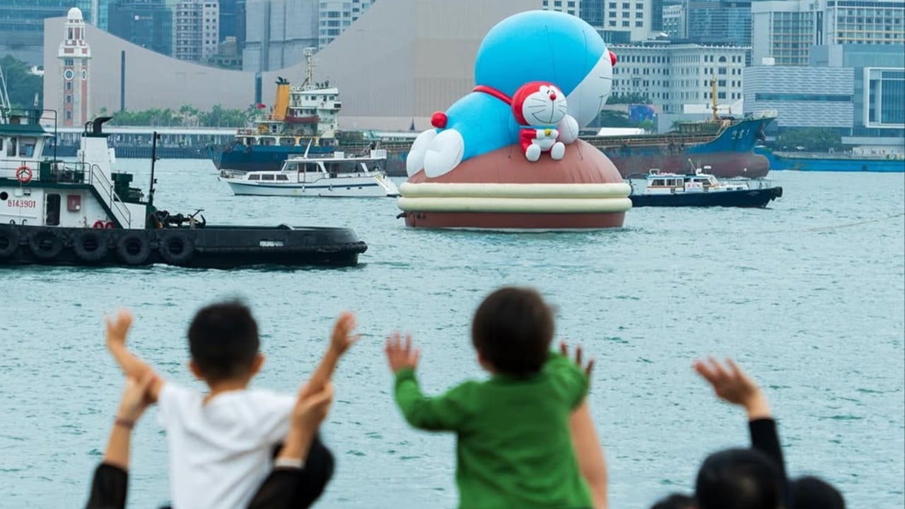 Четирите гигантски надуваеми лодки са герой от японската манга Doraemon, версия на Kaws на Elmo от улица Sesame, Grimace на McDonald’s и Labubu на хонконгския дизайнер Lung Ka-sing.