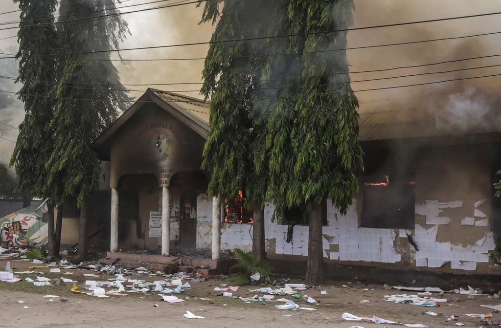 Избирателна секция е опожарена, докато избухват сблъсъци в Дар ес Салам на 29 октомври. Снимка: AFPИзбирателна секция е опожарена, докато избухват сблъсъци в Дар ес Салам на 29 октомври. Снимка: AFP