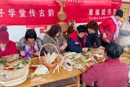 Земеделски производители плетат занаяти със сламки от трева, за да подпомогнат местния социално-икономически напредък в град Кишан под Джаоюан, провинция Шандонг. [Photo provided to chinadaily.com.cn]