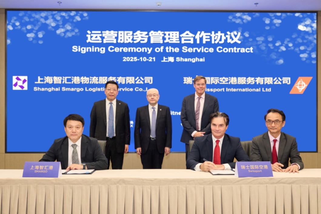 На 21 октомври между Swissport International AG и Shanghai Smargo Logistics Services Co Ltd е подписано сътрудничество за разработване на карго терминал на международното летище Shanghai Pudong в еталонно интелигентно логистично съоръжение. [Photo provided to chinadaily.com.cn]